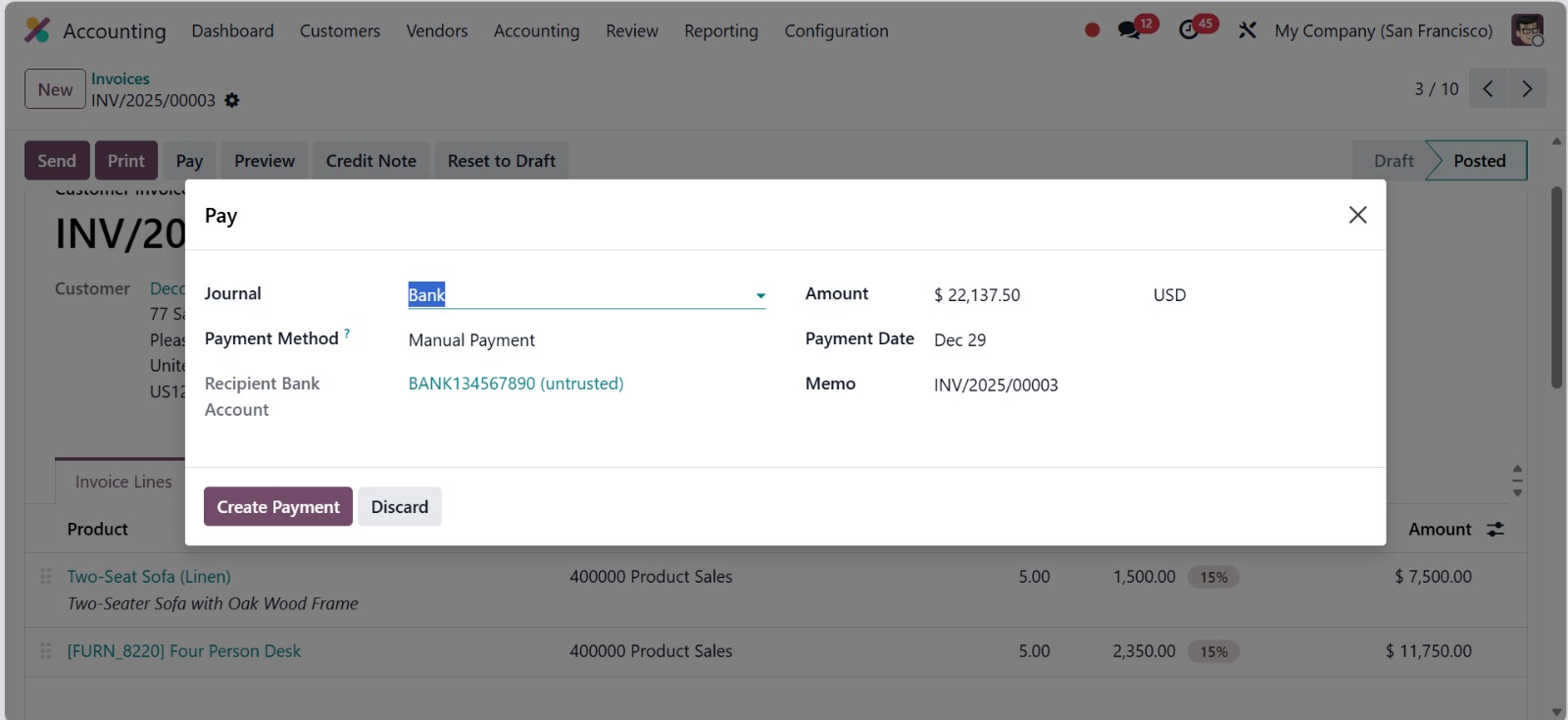 Odoo Accounting centralizes all financial operations, giving you real-time control over cash flow, receivables, and payables. Sync your bank statements automatically, manage recurring bills, track payments, and generate professional invoices — all from one unified platform.